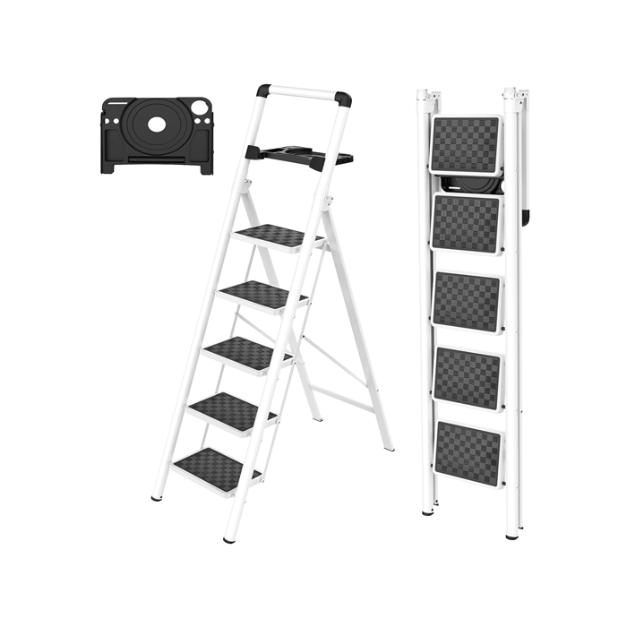 5 step ladder features a practical tool platform, that’s integrated with the ladder, you can put repair tools, paint buckets, gloves, spanners, wrenches, paint buckets, light bulbs on it